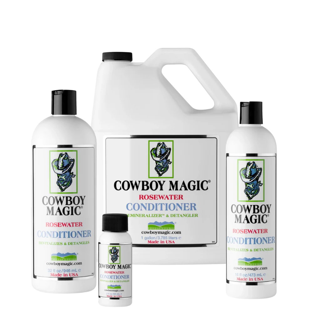 Cowboy Magic® Concentrated Rosewater Conditioner is een innovatieve verzorging voor paarden en huisdieren, gebaseerd op professionele salonbehandelingen uit de humane haarverzorging. De conditioner neutraliseert en zuivert het haar, wat zorgt voor een zichtbaar gezondere, gladdere en beter hanteerbare vacht.