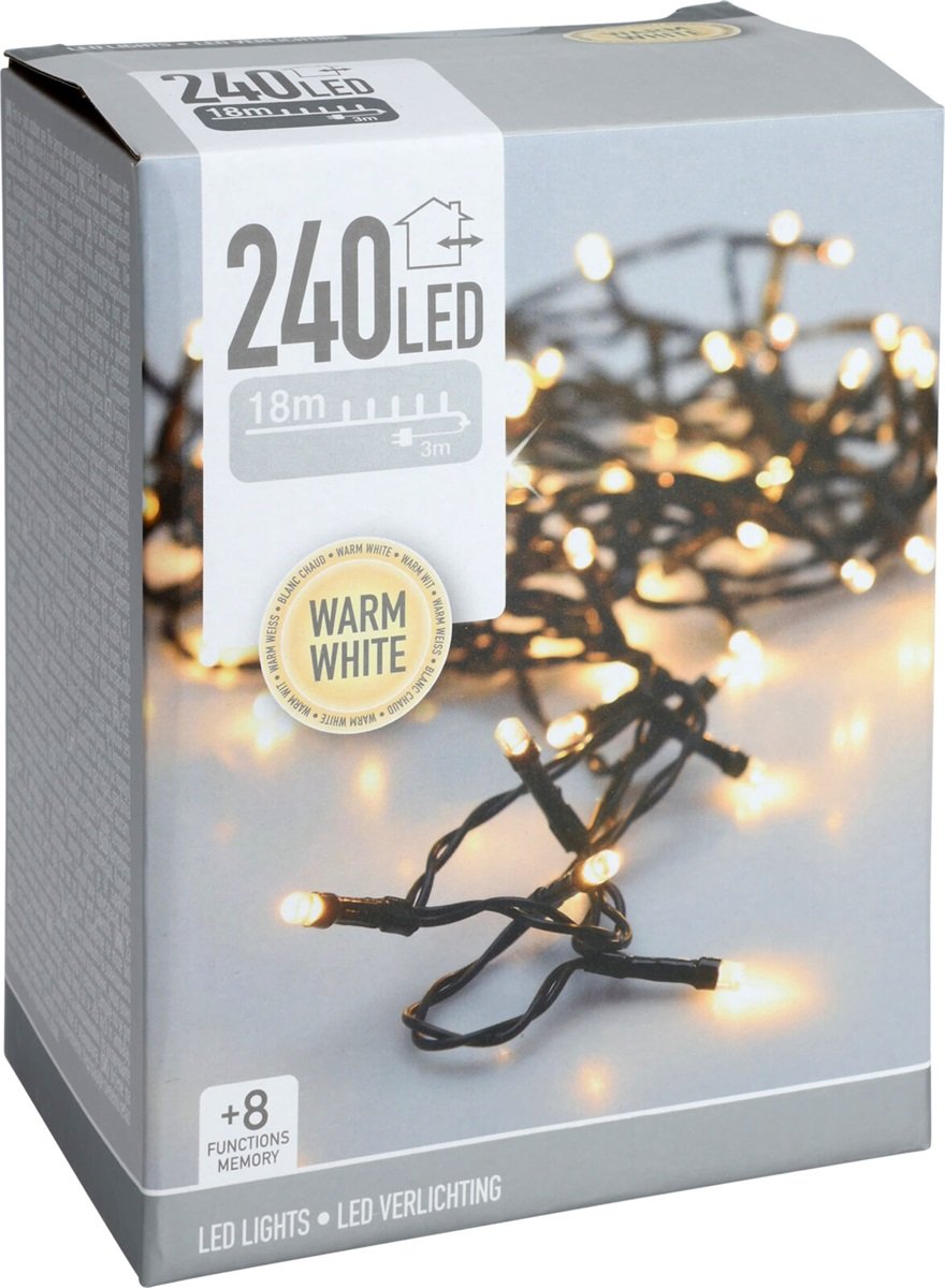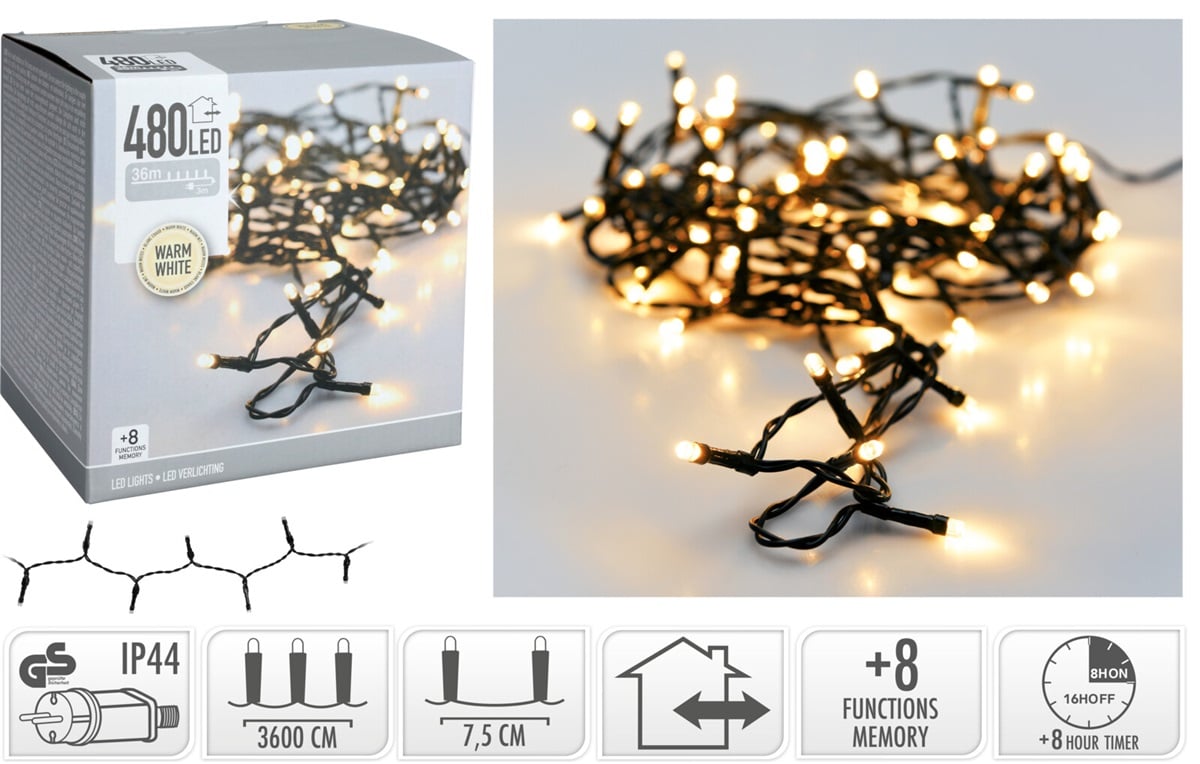 LED verlichting warm-wit met 8 lichtfuncties en 8-uurs timer. Geschikt voor binnen en buiten. Flexibel aan te sluiten dankzij 3 meter aanloopsnoer.
